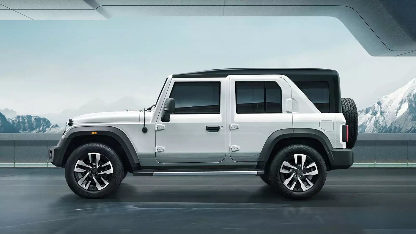 On the sides, its chunky all-terrain tires, flared wheel arches, and functional roof rails are complemented by optional accessories like a roof rack and auxiliary lights. These elements not only enhance its aesthetics but also serve practical purposes for outdoor enthusiasts. The rear end is equally striking, with a tail-mounted spare wheel and LED tail lamps that reflect its tough yet stylish character.